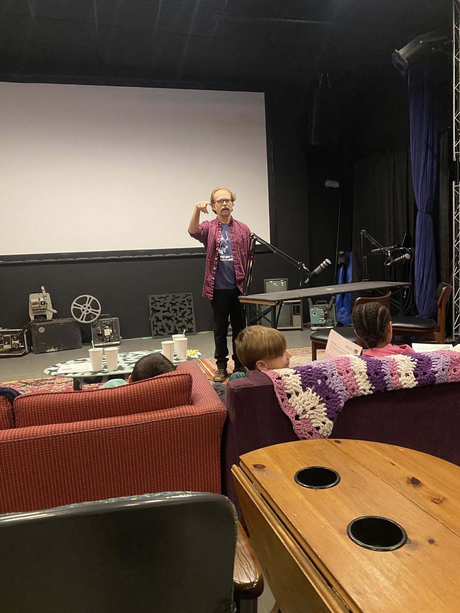 Longtime Cucalorus Chief Instigating Officer Dan Brawley guided the elementary and middle school students in how they should consider films as they watch them and explained the technical difference between feature and short films.“I want you to actively observe these films today. Be thinking about what you’re seeing. In addition to how it makes you feel, think about why,” he said. Munching on cups of popcorn from the lobby’s concessions, students watched short films including one about a group of little girls playing astronauts during a sleepover and planning a mission and a black and white movie called The Private Life of a Cat.